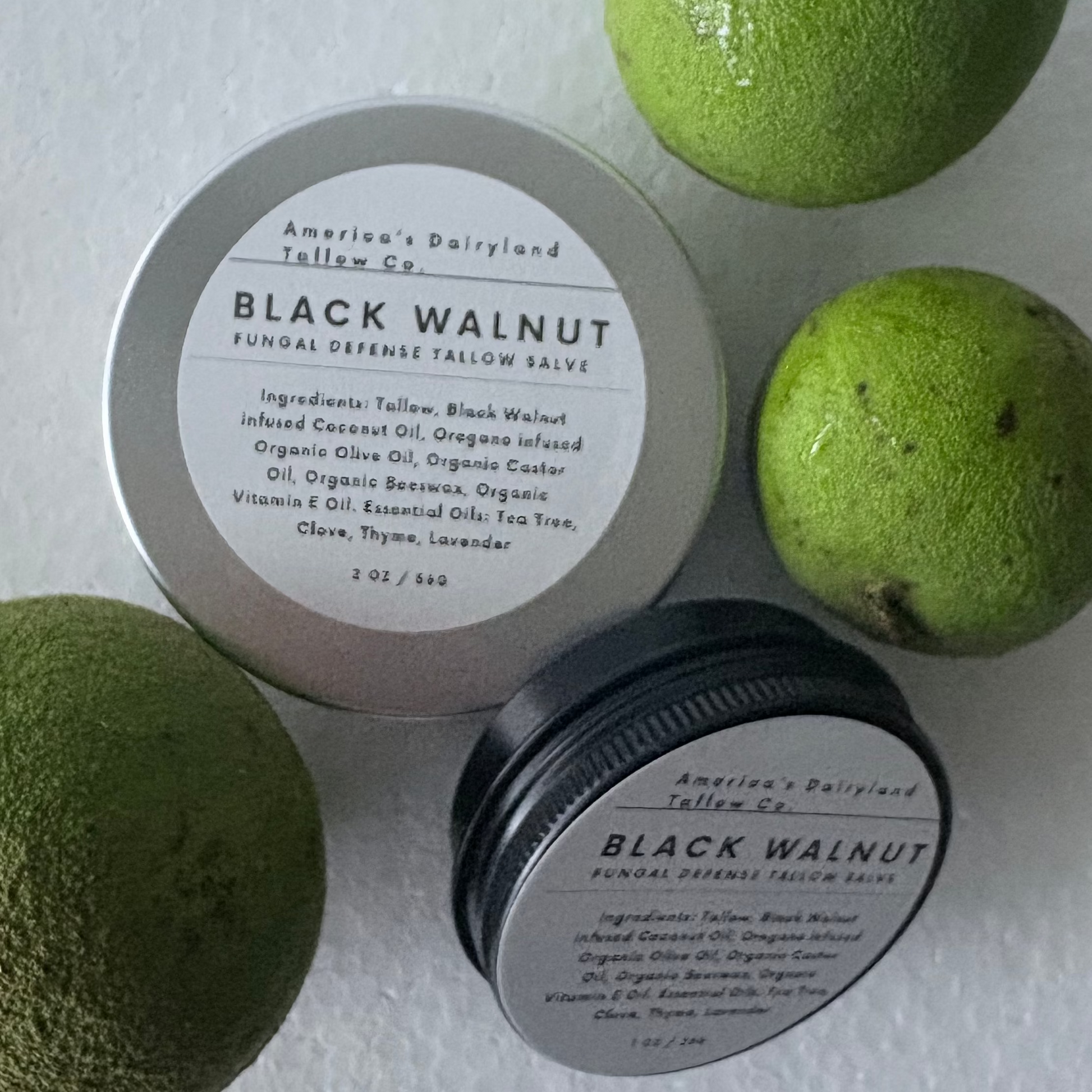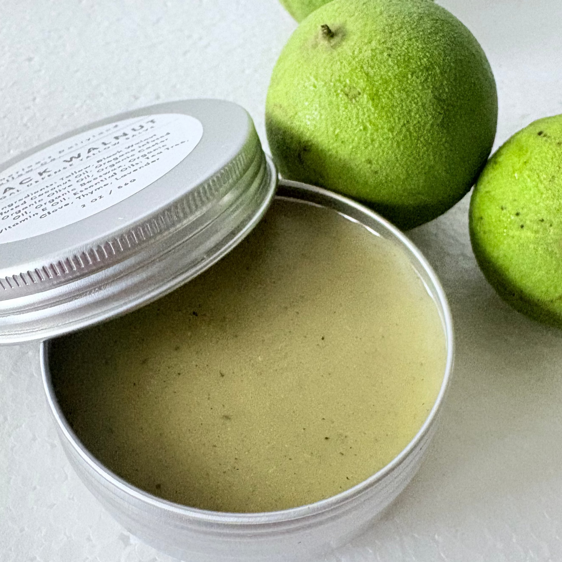 - Black Walnut Hull (Wild-harvested & Processed) -Infused Coconut Oil – Traditionally used in herbalism: Black walnut hulls contain juglone, a compound with powerful antifungal, antiparasitic, and antibacterial properties, which have been traditionally used for conditions like athlete's foot, parasitic infections, and syphilis